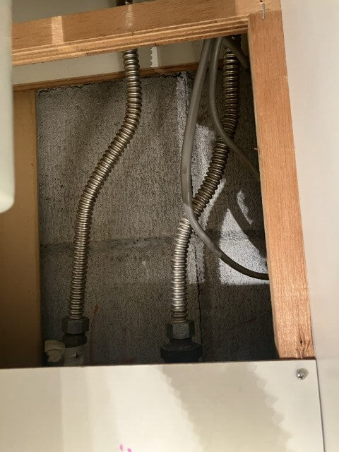 このフレキ管の右側には水が、左側にはお湯が通ります。