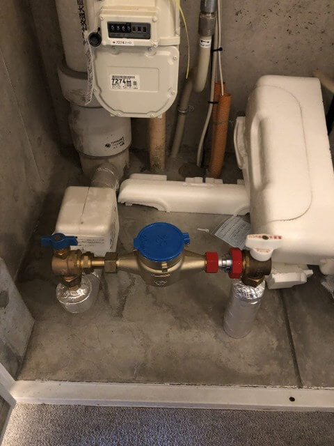 マンションの場合はパイプスペースの中に水道メーターとバルブがありますので、バルブを閉めて止水します。