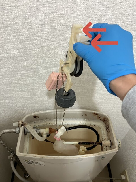 タンク内の水を排水したらレバーの先端にあるクリップを引き抜きます。